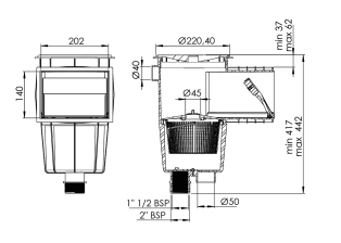 - Conexión inferior de la boquilla de aspiración: rosca interior 1½”, rosca exterior 2”.